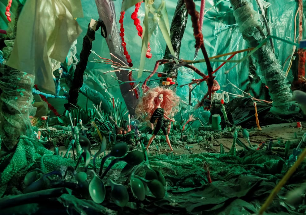 在首都基輔的「被塑膠包裹」特展上,烏克蘭導演尤迪(Vladi Yudi),展出了他拍攝的恐怖卡通場景。其中,主角蓋比(Garbie)是「垃圾」(Garbage)和「芭比」(Barbie)的結合,只見她行走在用塑膠垃圾搭起的場景中。