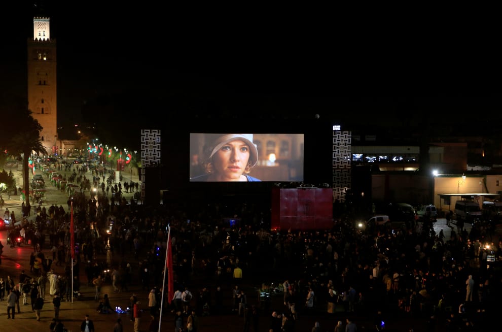 時值馬拉碦什(Marrakech)國際電影節,人們在傑馬拉夫納廣場(Jamaa Lafna square)的大銀幕下觀賞電影。