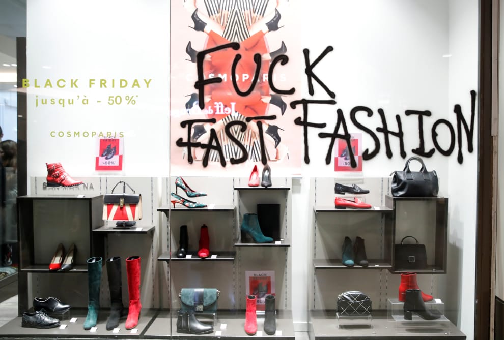 在「黑色星期五」大減價這天,巴黎四時商業中心的一間百貨櫥窗上,被環保人士噴上了「去你的快時尚」字樣,抗議快時尚產業對環境的破壞,以及消費者對資源的浪費。
