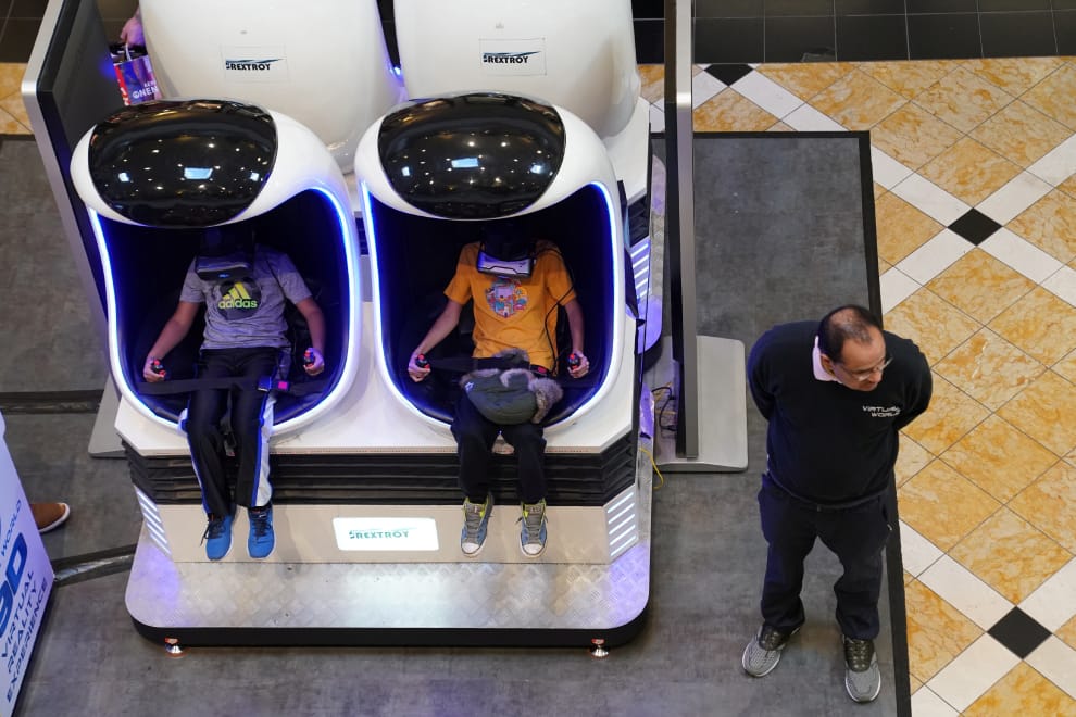 在賓州的普魯士王(King of Prussia)購物中心內,孩子們在家人趁著「黑色星期五」搶便宜的同時,在購物中心享受虛擬實境遊戲的樂趣。