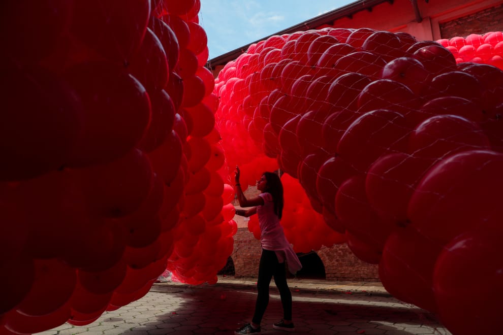 在巴西聖保羅的Emilio Ribas醫院,工作人員正在準備一顆顆紅色氣球,準備在「世界愛滋日」(12月1日)這天施放。