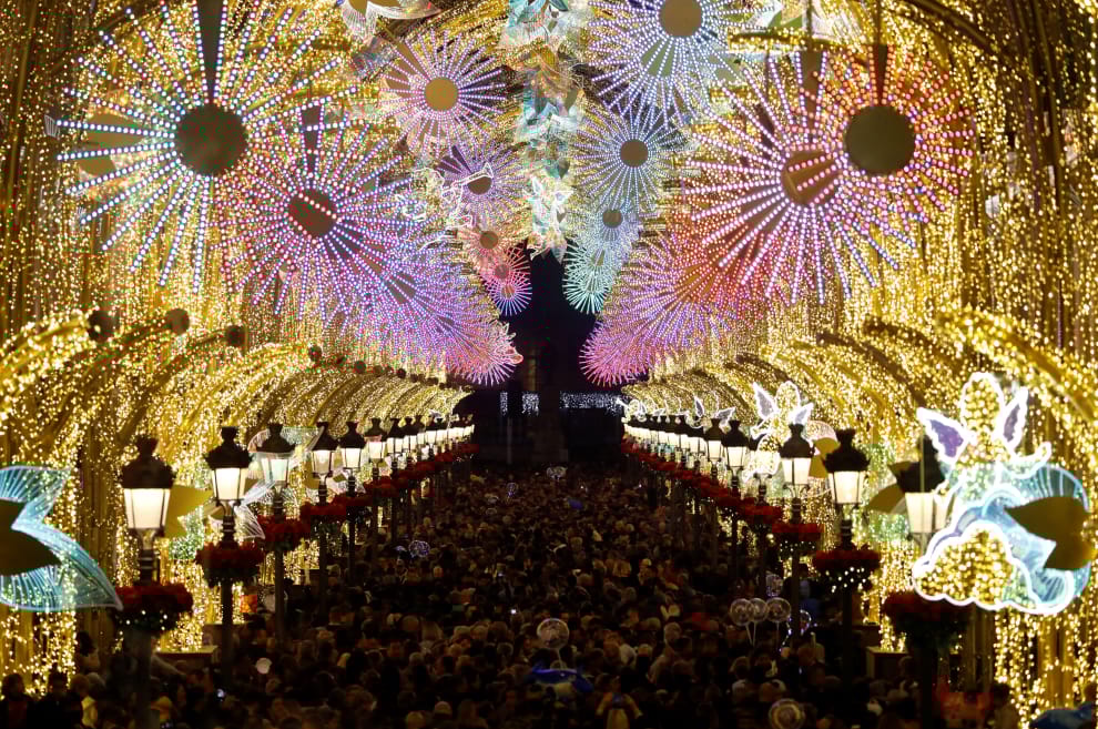 在馬拉加的拉里奧侯爵街(Marqués de Larios Street)上,可以看到璀璨華麗的聖誕燈飾,宣告佳節即將到來。