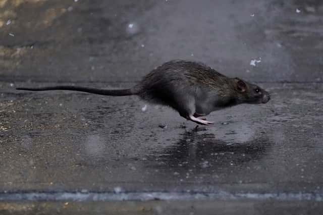 在紐約曼哈頓街頭一個下雪的日子裡,一隻老鼠快步奔跑在人行道之間。