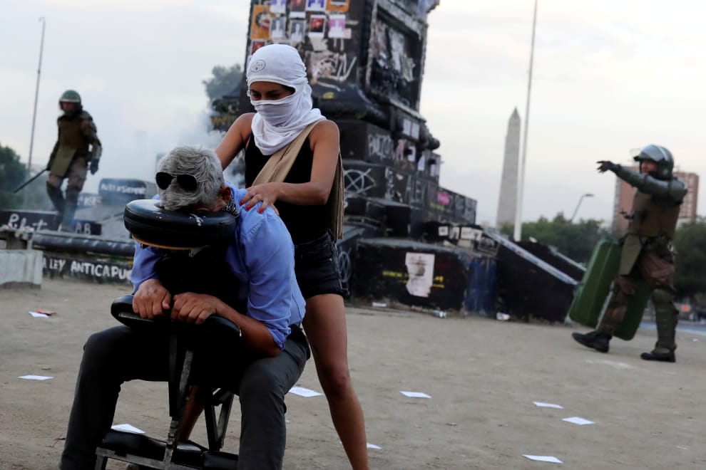 在市區的「義大利廣場」(Plaza Italia),一名示威者就地幫另一名同伴按起摩來,在他們背後則是忙著清場的鎮暴警察。