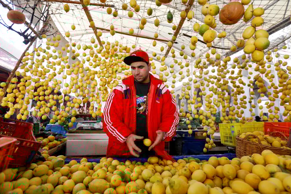 在首都突尼斯的鬧區,一名小販在市場忙著兜售檸檬。