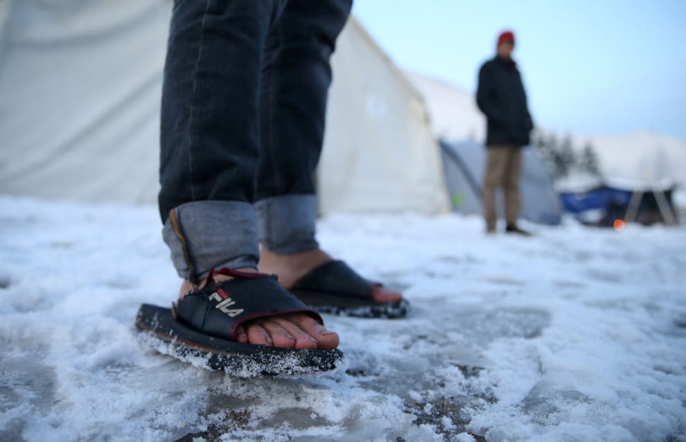 在克羅埃西亞邊境地帶,白雪已經降臨到臨時搭建的移民區。