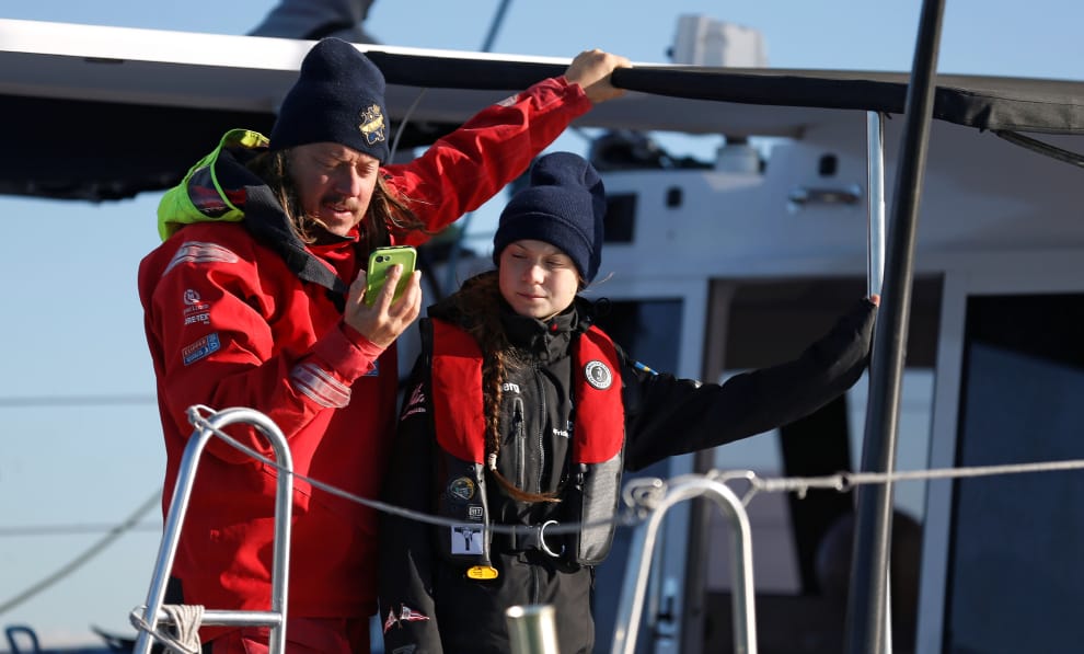 環保鬥士桑柏格(Greta Thunberg)父女乘著船抵達港口城市聖阿馬魯(Santo Amaro),準備前去參加 2019年聯合國氣候變化大會(COP25)。