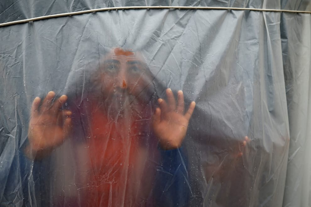 在加薩走廊北方的Beit Lahiya鎮,一名男子透過覆蓋在房子外頭的透明塑膠布往外看著下雨天。