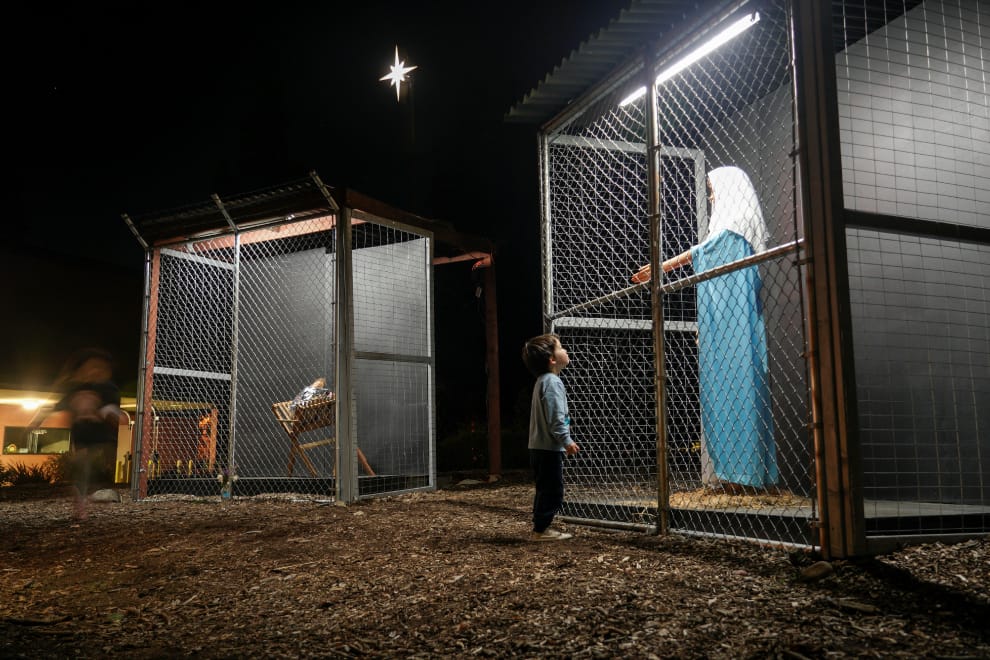 在加州洛杉磯的克萊蒙特聯合循道會(Claremont United Methodist Church),一名孩童看著被關在鐵籠裡的聖母瑪利亞,聯合循道會希望透過這樣的方式,讓人思考有關難民的議題。