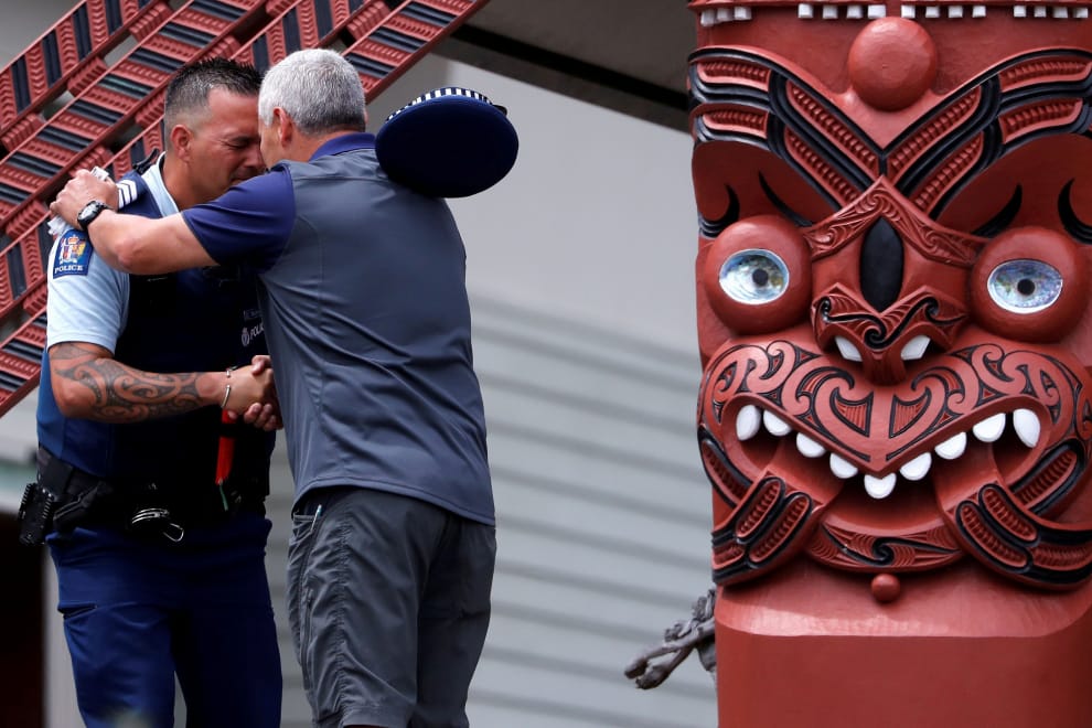 在最靠近懷特島(White Island)的華卡塔尼鎮(Whakatane),一名警官和一名男子在參加完為火山爆發罹難者親屬舉辦的「卡拉幾亞」(Karakia)毛利祈禱儀式後,用「碰鼻禮」(Hongi)向對方打招呼。