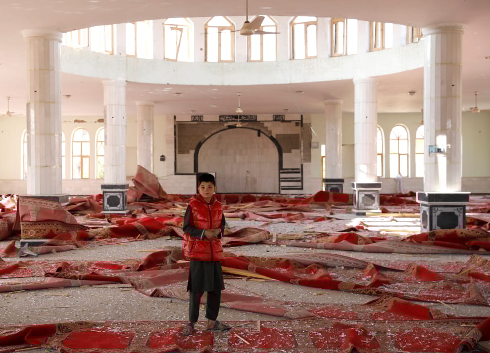 在美國設於阿富汗的巴格拉姆空軍基地(Bagram Air Base),一名男孩站在剛剛遭到阿富汗武裝組織塔利班(Taliban)攻擊的清真寺內。