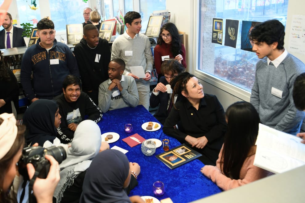 在瑞典首都斯德哥爾摩郊區的林可布(Rinkeby)學校圖書館內,來自波蘭的 2018年諾貝爾文學獎得主朵卡萩(Olga Tokarczuk,黑衣坐下者)正在和學生們聊天。