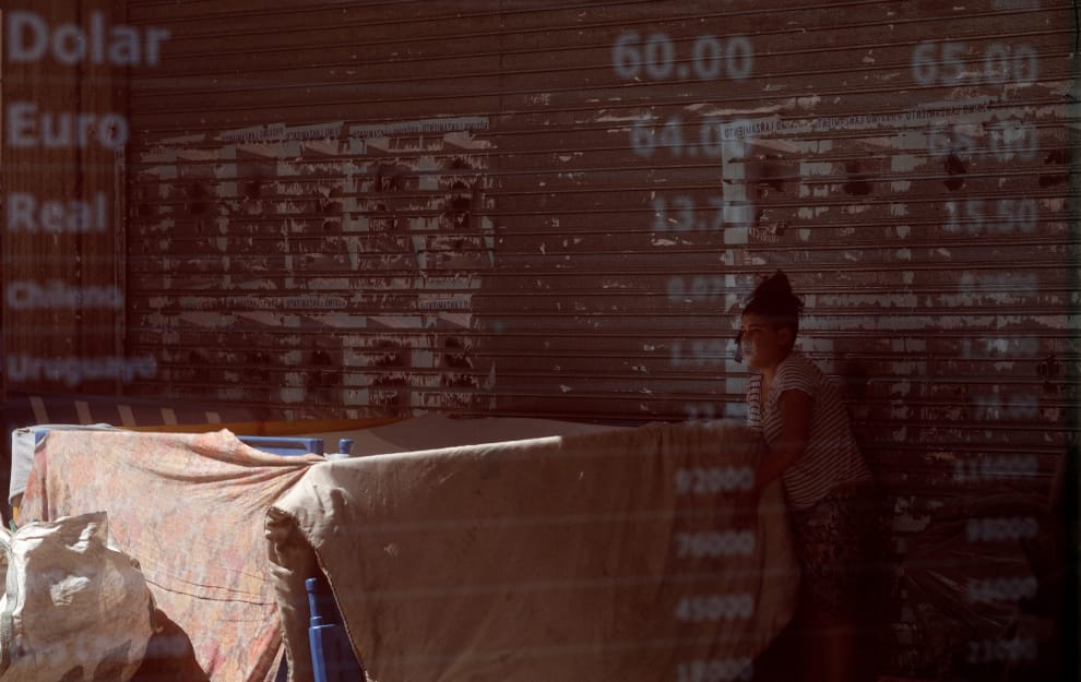在首都布宜諾斯艾利斯,電子看板上的匯率變動隔著窗戶投射在一名街友的身上。