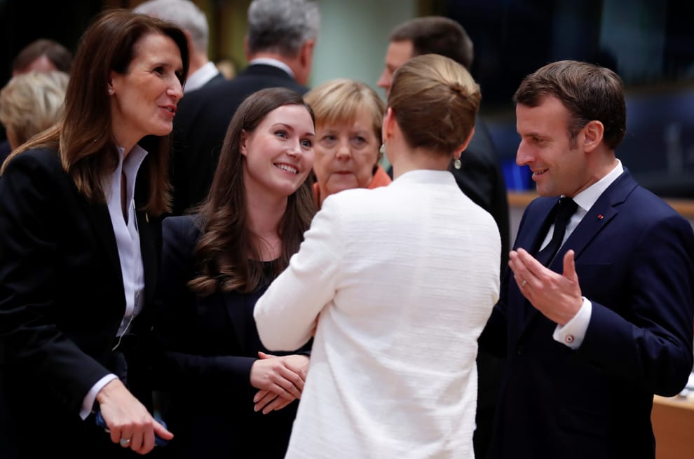 在布魯塞爾舉辦的歐盟領導人高峰會上,第一次參加、剛剛走馬上任的芬蘭總理馬林(Sanna Marin,左二)正在和比利時首相威爾梅斯(Sophie Wilmes,左一)、德國總理梅克爾(Angela Merkel,中)、丹麥首相佛瑞德里克森(Mette Frederiksen,右二)和法國總統馬克宏(Emmanuel Macron,右一)談話。