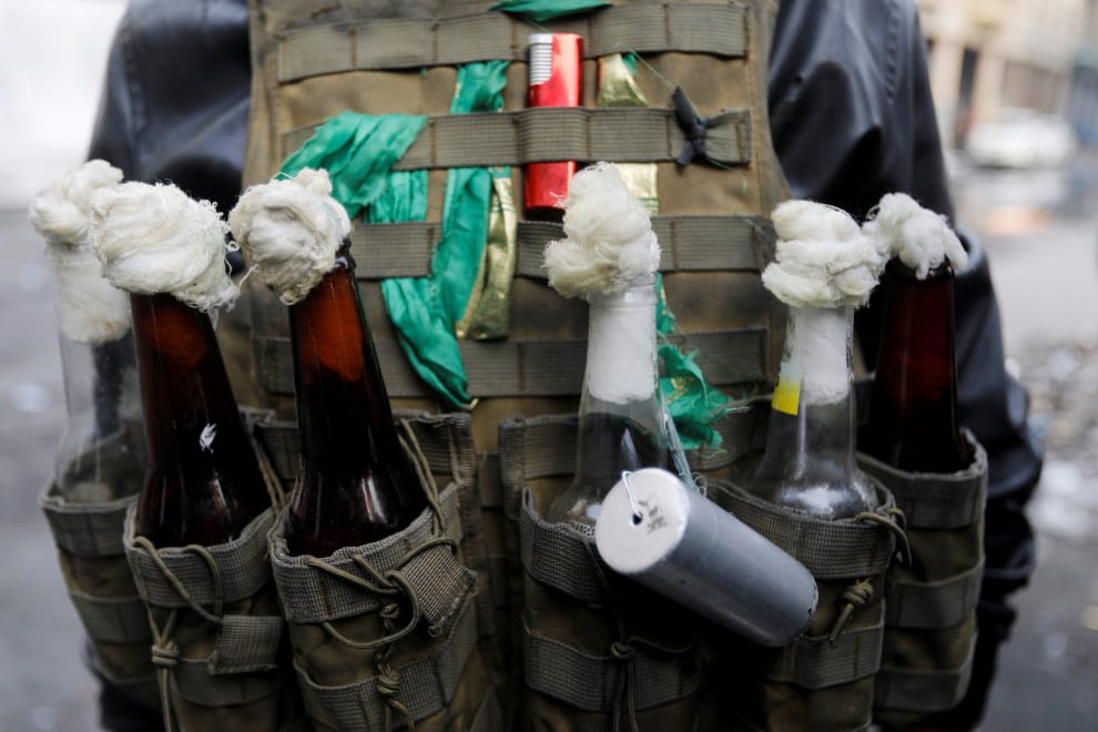 在首都巴格達,一名反政府的示威民眾對著鏡頭秀出自製汽油彈。