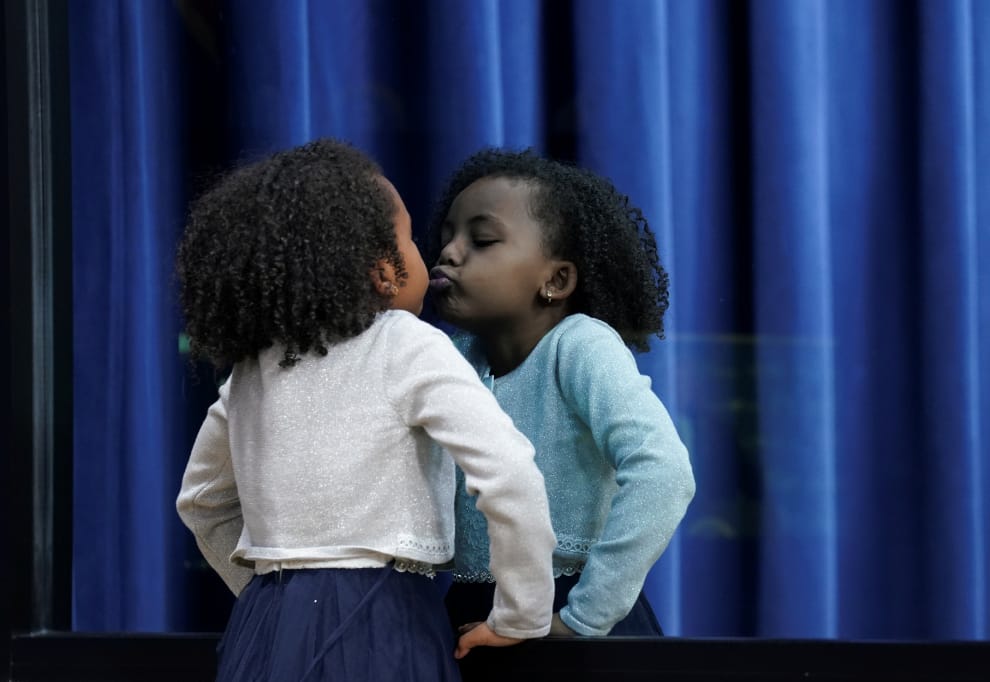 在白宮,今年 4歲的貝瑞奇(Elgrace Bereket)對著鏡子擠眉弄眼,此時美國總統川普(Donald Trump)正在台上發表兒童照護和育嬰假演說。