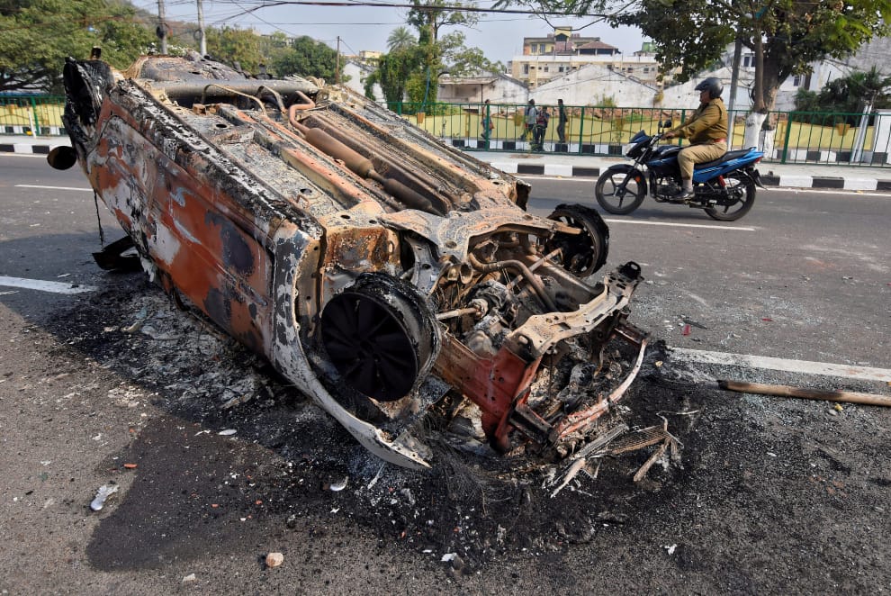 在阿薩姆邦的第一大城古瓦哈提(Guwahati),一名警察騎著機車經過遭到抗議民眾縱火的車輛。