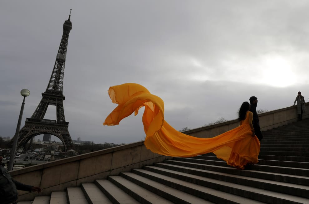 在巴黎著名地標艾菲爾鐵塔前,一對情侶緩緩走上台階,女方穿著的橘色禮服裙襬被風吹了起來。