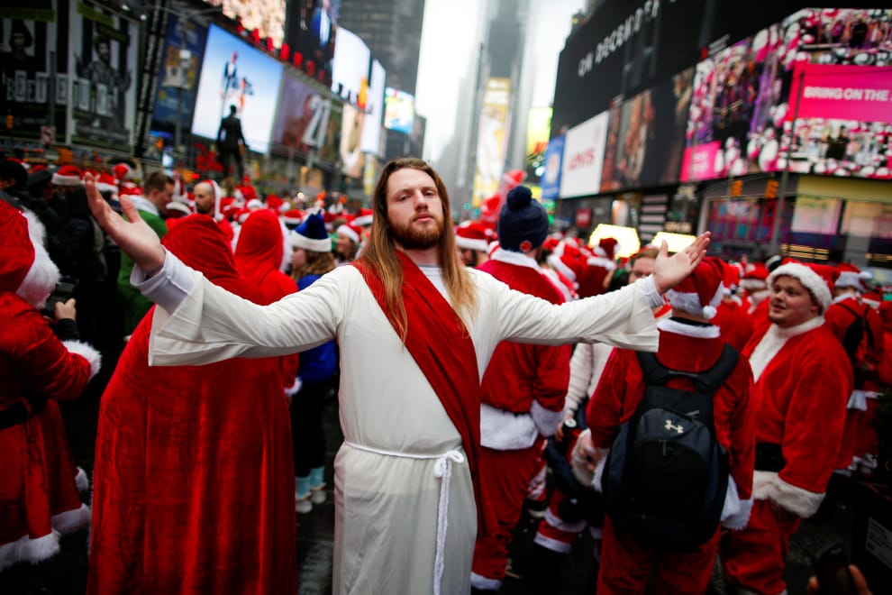 在紐約時代廣場,人們打扮成耶穌與聖誕老人的模樣,參加一年一度的聖誕老人大會(SantaCon)。
