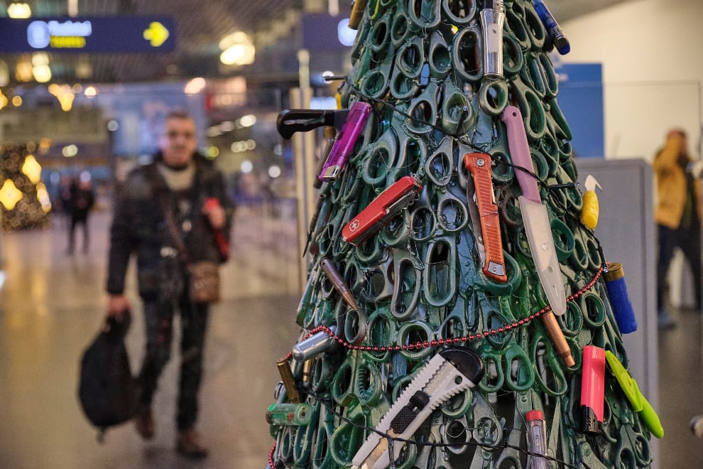 在維爾紐斯國際機場(Vilnius airport)的出境大廳,機場工作人員用來自乘客的違禁品做了一棵聖誕樹,走近一看可以發現瑞士刀、剪刀、打火機、美工刀等不能帶上飛機的危險物品。