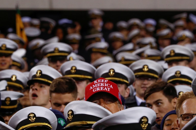 在賓州的林肯金融體育場(Lincoln Financial Field),美國總統川普(Donald Trump)頭戴寫著「讓美國再次偉大」字樣的帽子,參加一年一度的海軍學院美式足球比賽。