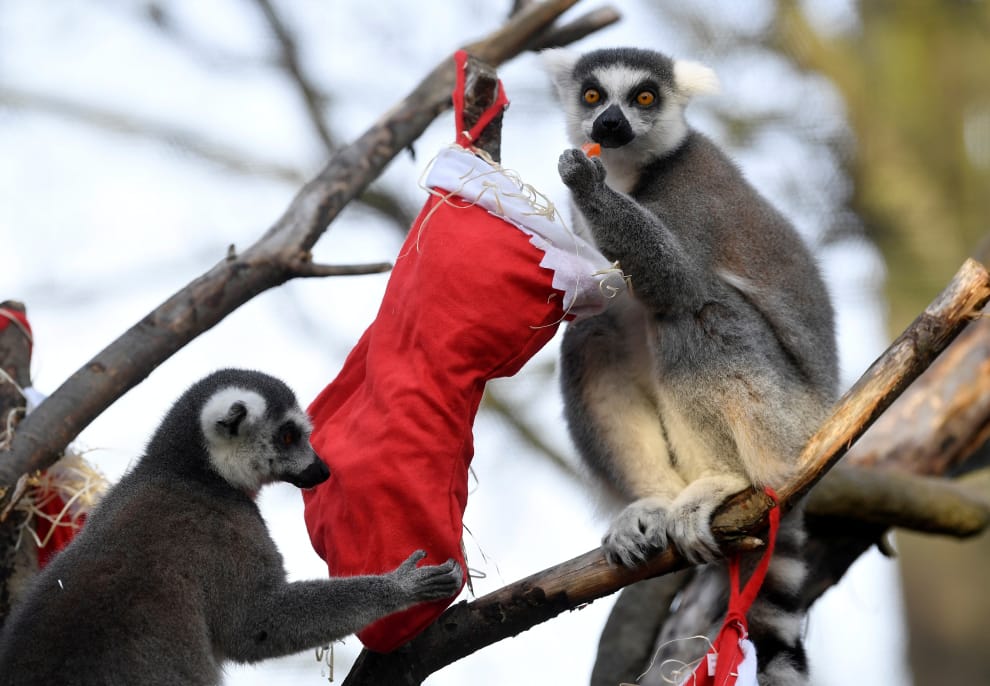 在倫敦動物園,狐猴們正在吃襪子裡的聖誕大餐,準備和大家一起過一個肚子飽飽的聖誕節。