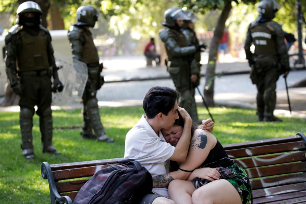 在首都聖地牙哥,一名男子在公園長椅上安慰一名女子,他們的身後是當局出動的維安部隊,準備鎮壓反政府的示威民眾。