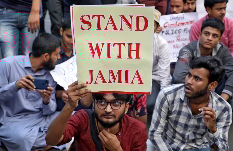 在加爾各答,印度學生伊斯蘭組織(Students Islamic Organisation of India,SIO)的成員高舉寫有「和JAMIA站在一起」字樣的牌子,支持國立伊斯蘭大學(Jamia Millia Islamia university)的學生運動。國立伊斯蘭大學的學生們為了反對《公民身份修正法案》(Citizenship Amendment Bill,CAB)和警方發生嚴重衝突,警方也開始無差別攻擊抗議民眾、施放催淚瓦斯、痛毆學生,甚至是進入校園宿舍、圖書館、廁所等處將學生揪出來施暴,並且拘留了超過 100名學生。