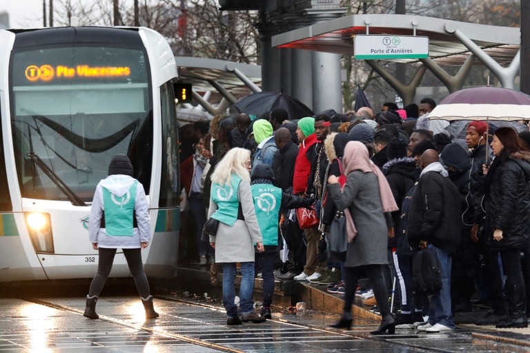 在下著雨的巴黎街頭,通勤民眾耐心地等待電車的到來。因為法國國營鐵路公司(SNCF)和巴黎大眾運輸公司(RATP)工會罷工的關係,通勤班次大幅減少,不少通勤民眾只好改用自行車或走路上班。
