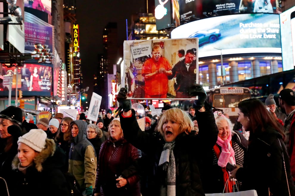 17號晚間,紐約時代廣場出現民眾示威,他們高舉美國總統川普(Donald Trump)身穿橘色囚衣的照片,要求眾議院議員們表決通過川普彈劾案,讓川普往下台之路邁進。