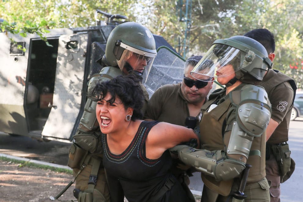 在首都聖地牙哥街頭,一名反政府示威民眾被維安部隊給抓了起來。