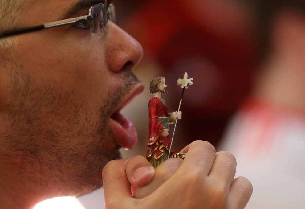 在里約熱內盧,一名巴西佛朗明哥(Flamengo)足球隊的球迷手拿神像,祈禱球隊能夠贏過沙烏地阿拉伯希拉爾(Al Hilal)足球隊。
