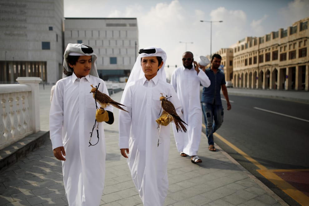 在首都杜哈街頭,兩名男孩帶著他們的獵鷹上街,這樣的場景在當地並不罕見。