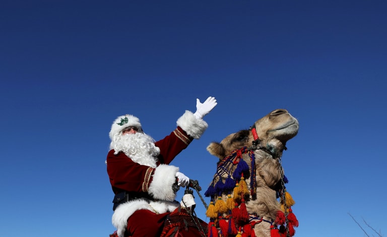 在耶路撒冷老城區,一名男子穿上了聖誕老人的服裝,騎著駱駝參加一年一度的聖誕樹分發活動。