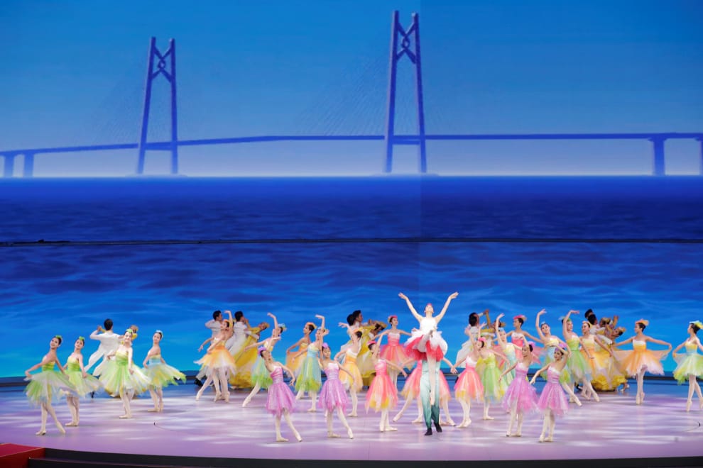 在澳門回歸中國 20年的紀念活動上,舞者們在港珠澳大橋的影像前表演,慶祝擺脫葡萄牙殖民地身分。