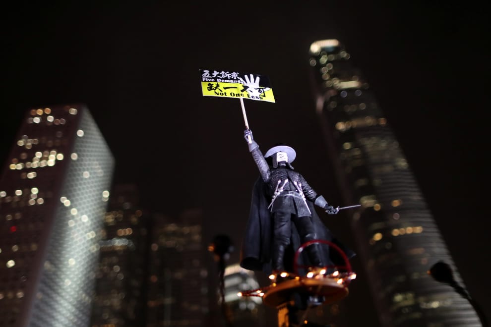 在香港街頭,反政府示威民眾讓一尊「蓋伊‧福克斯」(Guy Fawkes)的公仔手拿標語,上頭寫著「五大訴求,缺一不可」。