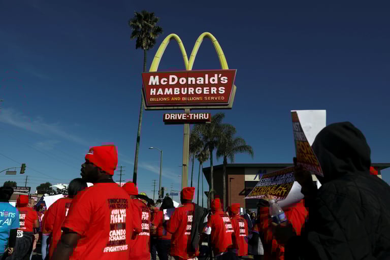 在加州洛杉磯一家麥當勞(McDonald's)速食連鎖餐廳前,工會成員加入了麥當勞廚師和收銀員的行列,要求麥當勞調漲他們的薪水,以及保障工會相關權利。
