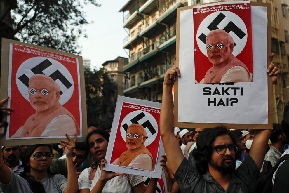 在孟買街頭,抗議民眾將印度總理莫迪(Narendra Modi)的照片加上了納粹符號,譴責他大力支持的《公民身份修正法案》(Citizenship Amendment Bill,CAB)是針對穆斯林移民的宗教歧視。