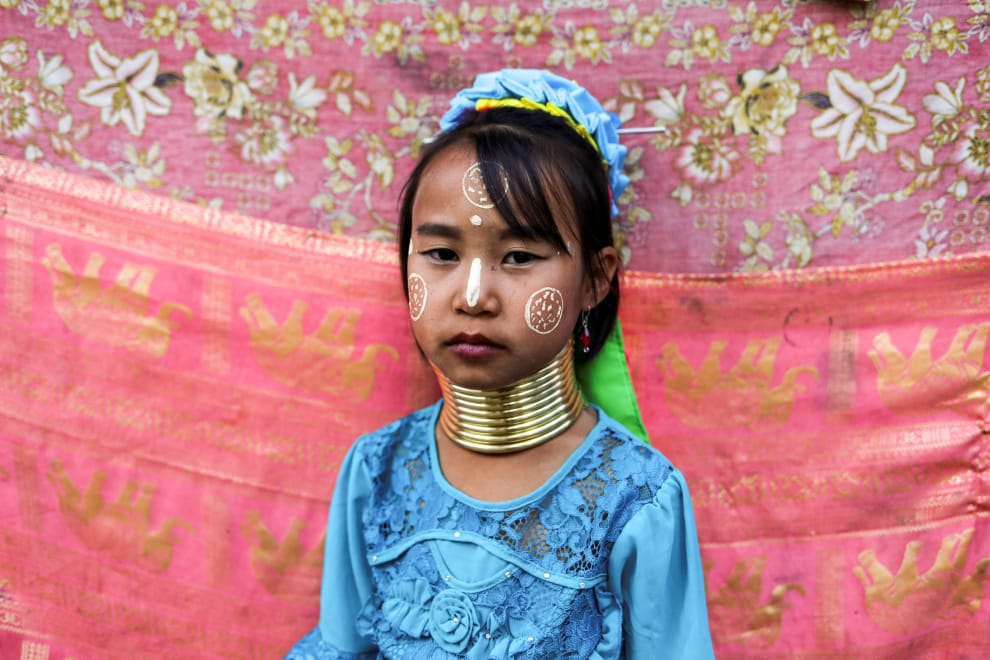 在一個作為觀光景點的克揚族(Kayan,俗稱長頸族)村落裡,一名女孩被攝影師的鏡頭給捕捉了下來。