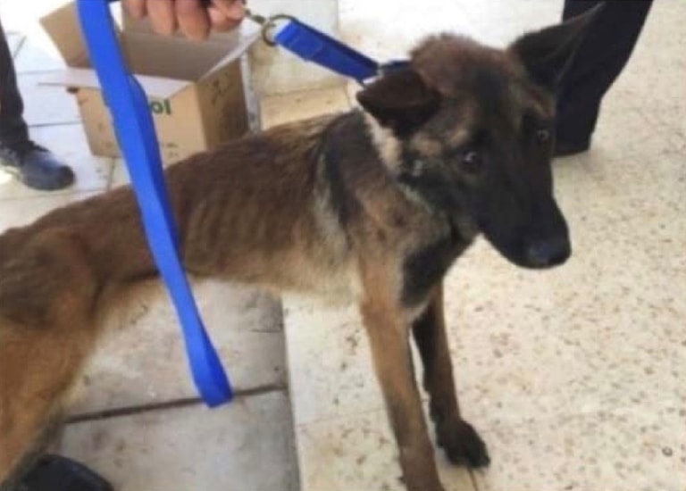 在這張日期不明的照片中,紀錄下被送往約旦執行一年任務的排雷犬,畫面中的牠瘦到僅剩皮包骨。