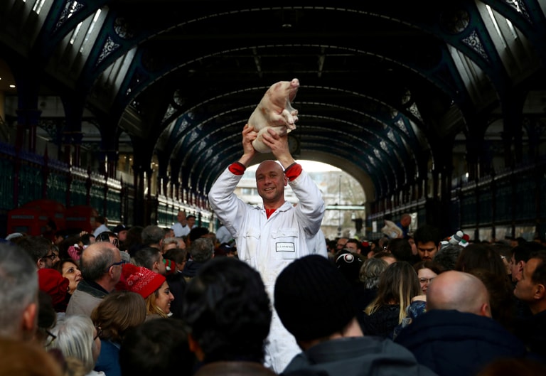來到倫敦的平安夜肉品拍賣會上,肉店老板高舉手上的小豬仔,希望有興趣的顧客可以掏錢參與競標。