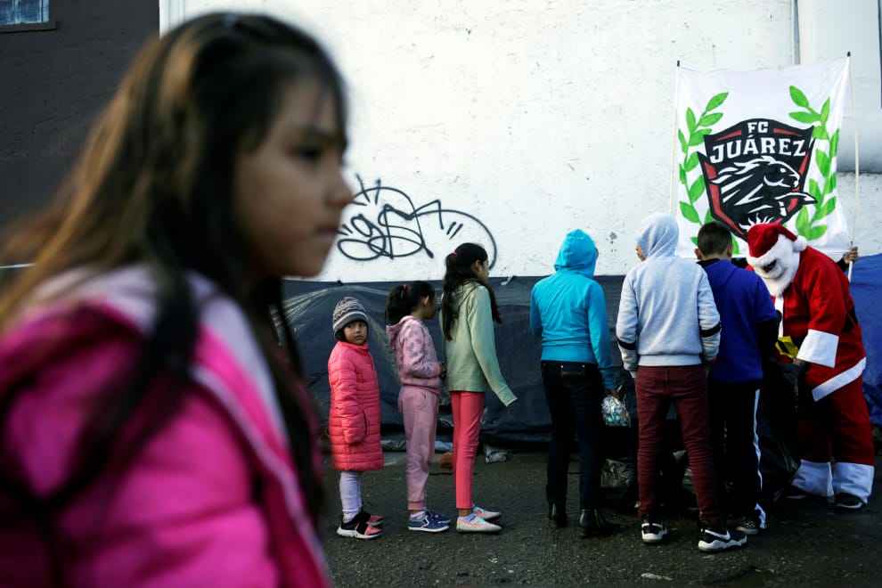 在墨西哥的庇護所裡,一名打扮成聖誕老人的男子正在發放袋子裡的玩具給裡頭的孩子們。