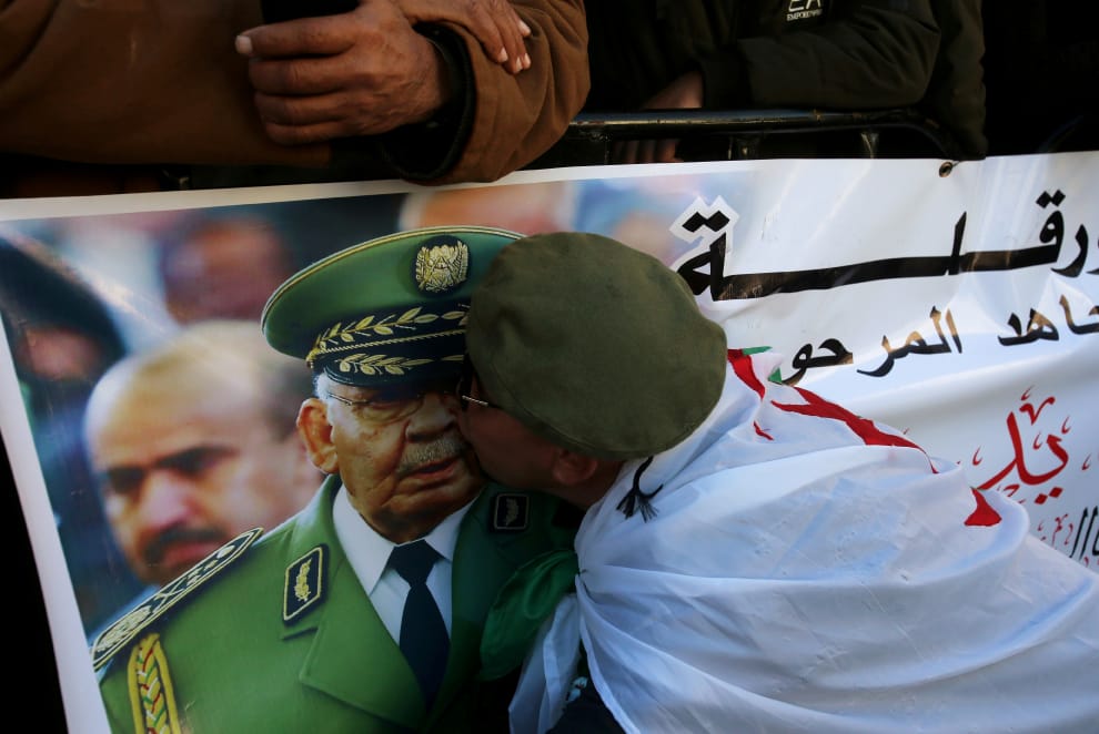 在葬禮上,一名男子彎身親吻了陸軍參謀長薩拉赫(Ahmed Gaid Salah)的照片,向這名曾經在阿爾及利亞政壇活躍的政治人物告別。