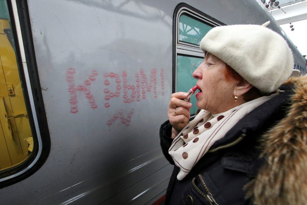 在克里米亞港灣城市賽凡堡港(Sevastopol),一名女子用唇印寫下了「克里米亞」字樣,慶祝這條從克里米亞直通俄國聖彼得堡(Saint Petersburg)的鐵路即將通車。