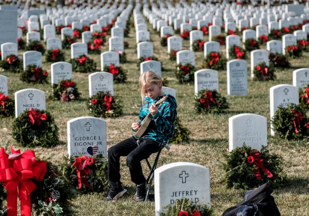 在阿靈頓國家公墓,今年 11歲的馬丁(Armando Martin)坐在這裡彈奏著吉他,與另一端的他人共享這一刻。