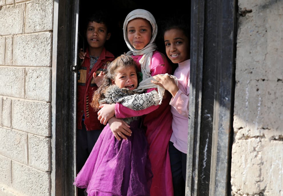 在首都沙那(Sanaa),一名女孩在被施打小兒麻痺疫苗後嚎啕大哭。這裡正在進行挨家挨戶的施打疫苗計畫。