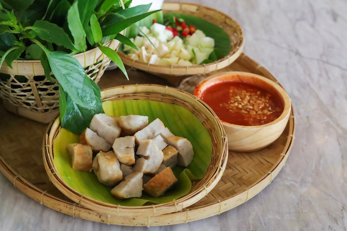 簡單來說,Nam Nueng 為越式蒸烤而成的香腸,通常會與米製春捲皮,小黃瓜、大蒜、芒果、生香蕉切片、辣椒,一大盤生菜,還有其「靈魂」所在,即嚐起來微辣又甜的「特製沾搭」配著一起吃,有點像是我們所熟悉的越南春捲,只不過在餡料方面更為豐富、食客還能自己動手做:把上述的食材放到水餃皮般大小的米製春捲皮上包起,然後沾些沾醬一起用,再佐些生菜來調和口味,另也可依照個人喜好來食用,像筆者通常會省略掉辣椒和大蒜丁,或是用生菜來代替米製春捲皮。