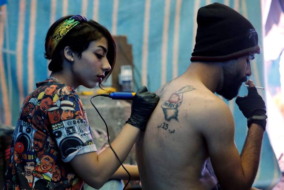 16歲刺青師馬拉姆(Maram)專心進行著刺青工作,這名顧客希望馬拉姆幫他把反政府的標誌刺在背上。