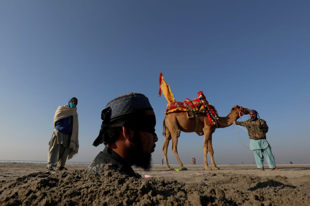 在城市克拉嗤(Karachi),20歲的阿赫塔爾(Mehrban Akhtar)把自己脖子以下的身體全埋在沙裡,靜待著日環食來臨。