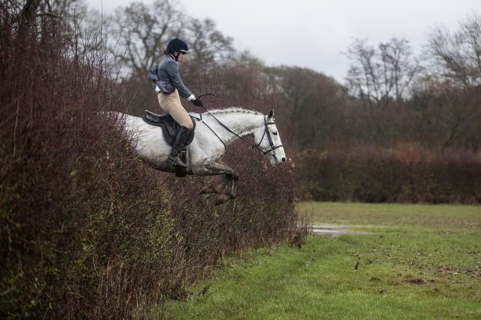 在一年一度的節禮日(Boxing Day)獵狐活動上,一名騎師策馬跳過了樹叢。